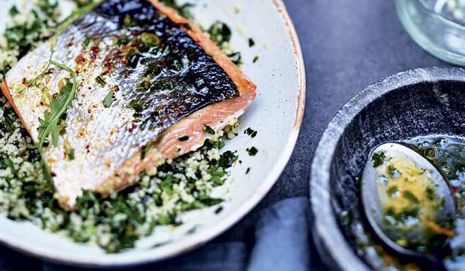 Filets de maquereau, pâtes orzo, légumes du soleil