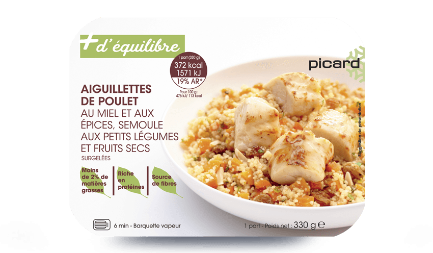 Légumes et duo de semoule cuisiné aux fruits secs 60%, morceaux d'aiguillettes de poulet rôti traité en salaison 20%, sauce au miel et aux épices 20% - surgelés.