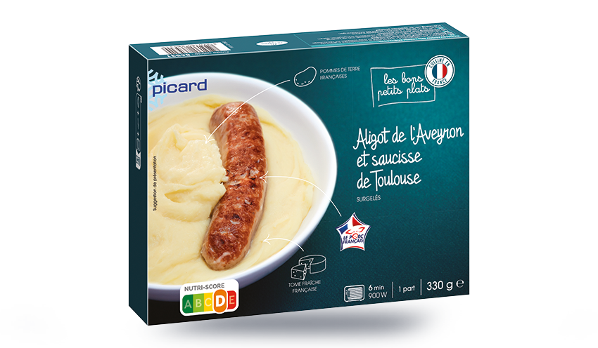 Purée 72,7% de pomme de terre à la tome fraîche, saucisse de Toulouse cuite 27,3%, surgelés