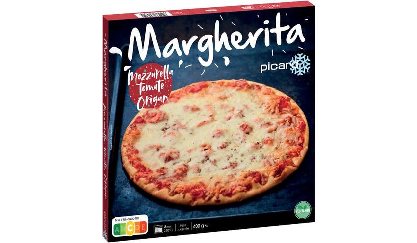 Pizza surgelée garniture 52,5% mozzarella, sauce tomate, basilic et origan, pâte précuite 47,5%.
