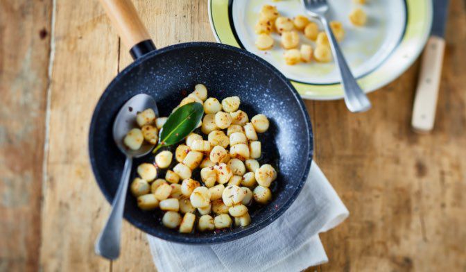 3 minFaites saisir les Saint-Jacques dans une poêle chaude avec un peu de matière grasse, à feu vif, 3 min, en remuant régulièrement.