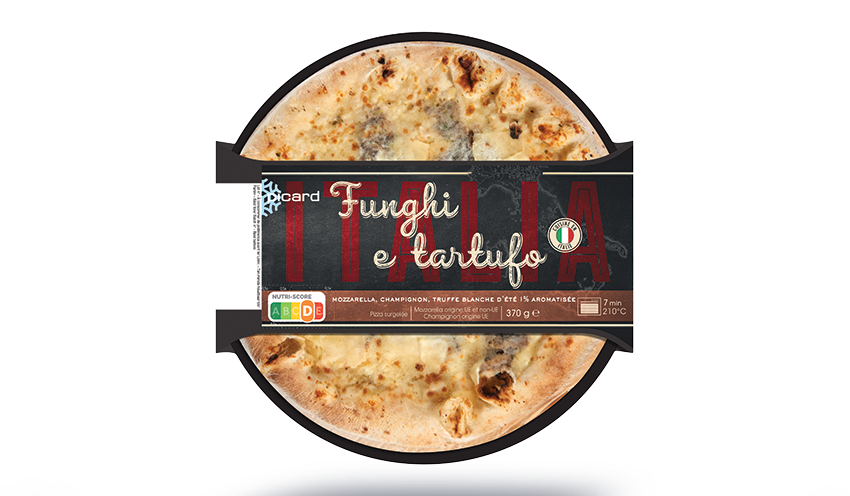 Pâte (56,3%), garnie de mozzarella (18,8%), de champignon de Paris (8,5%), de truffe blanche d’été Tuber aestivum (1%) aromatisée, cuite, surgelée.