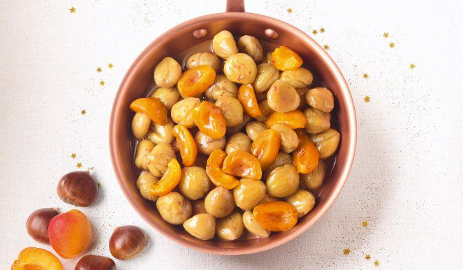 Des marrons entiers, accompagnés de quartiers d’abricots, cuisinés dans une sauce à base de crème de marron, de vinaigre balsamique, de beurre avec une pincée de piment d’Espelette et de cannelle… Une recette originale et haute en saveurs, parfaite pour accompagner vos viandes et volailles en cette période de fêtes.
