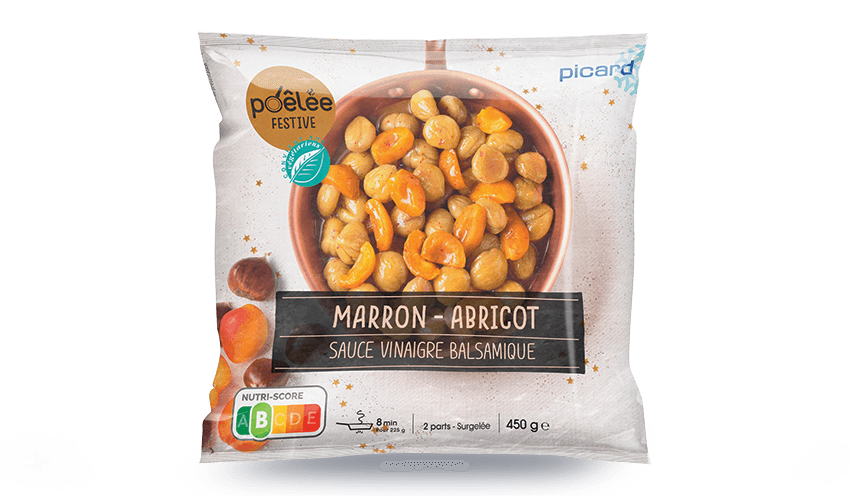 Poêlée composée de marron 53,5%, sauce à la crème de marron et au vinaigre balsamique 25% et abricot 21,5% , surgelée.