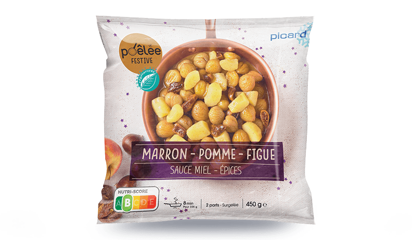Poêlée composée de marron 50%, sauce au miel et aux épices 27%, pomme 15% et figue sèche 8%, surgelée